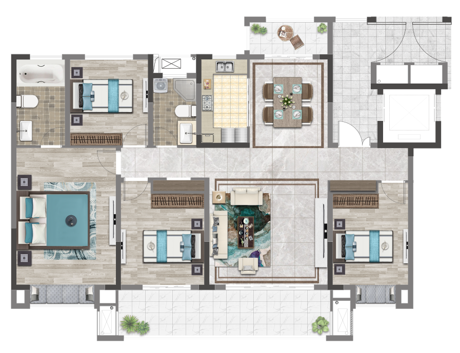 户型方正,南北通透,四房朝南 5米开间阔绰客厅 双阳台三卫,私密生活,轻松从容